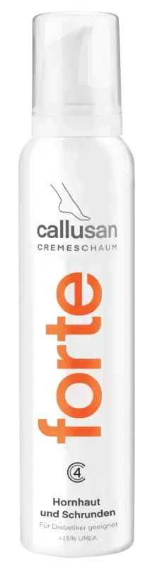 Callusan Forte contient une formule de soin avec une dose élevée d'urée (>15%) et de beurre de karité, qui adoucit sensiblement les callosités les plus tenaces, apporte l'hydratation nécessaire et augmente l'élasticité et la souplesse de la peau. L'application régulière de la crème-mousse améliore sensiblement le teint et prévient le développement des callosités. Sans parfums et colorants.