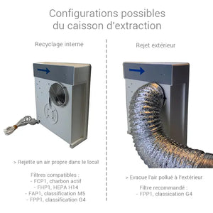 - en rejet extérieur (filtre pour rejet extérieur + gaine d’évacuation Ø 125 mm)