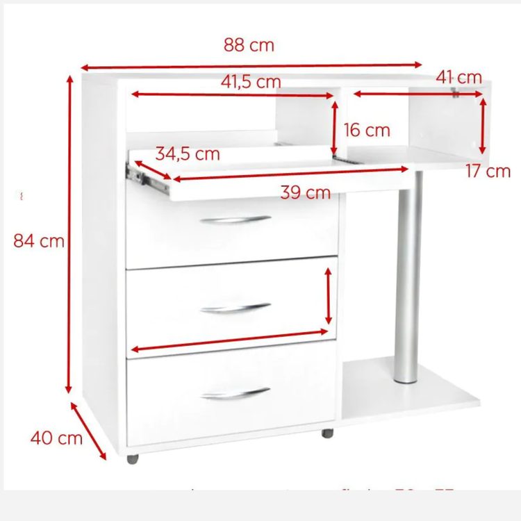Caractéristiques générales : • Meuble de podologie professionnel, robuste et fonctionnel • Conçu pour optimiser l’ergonomie et l’organisation du poste de soins • Plusieurs tiroirs de rangement, dont un tiroir dédié au stérilisateur UV-C • Étagère intégrée prévue pour accueillir un micromoteur • Support TUBE permettant la fixation directe d’une lampe loupe sur le plan de travail • Roulettes en métal et caoutchouc pour une mobilité fluide et sécurisée • Structure stable, adaptée à un usage intensif en cabinet • Matériaux durables, faciles à nettoyer et compatibles avec les protocoles d’hygiène • Fabrication européenne, gage de qualité professionnelle