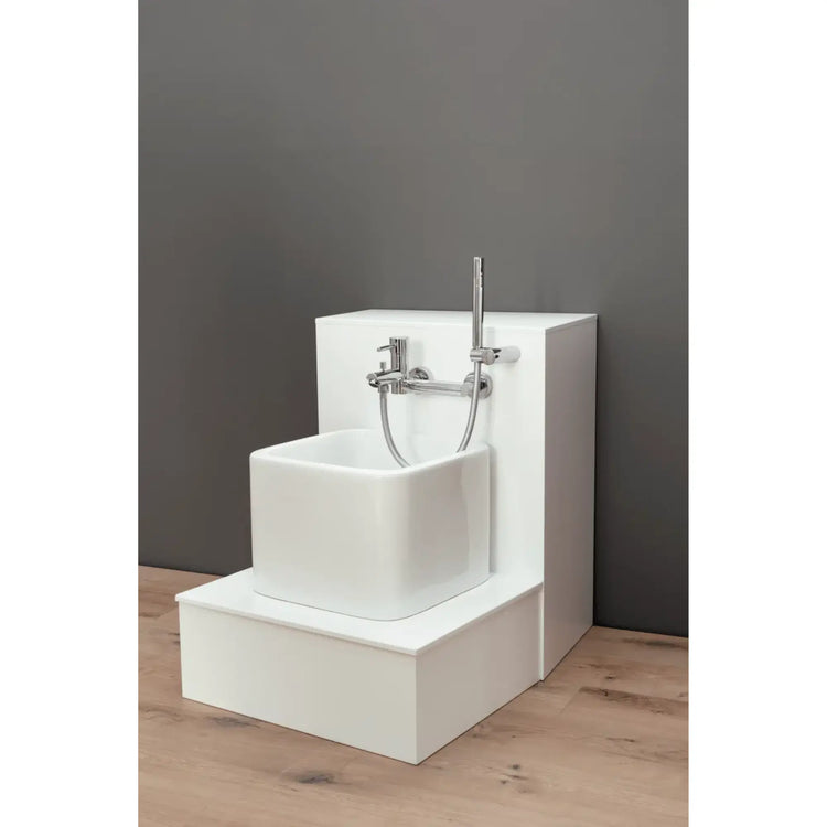 - A wooden base with a back wall for a footbath