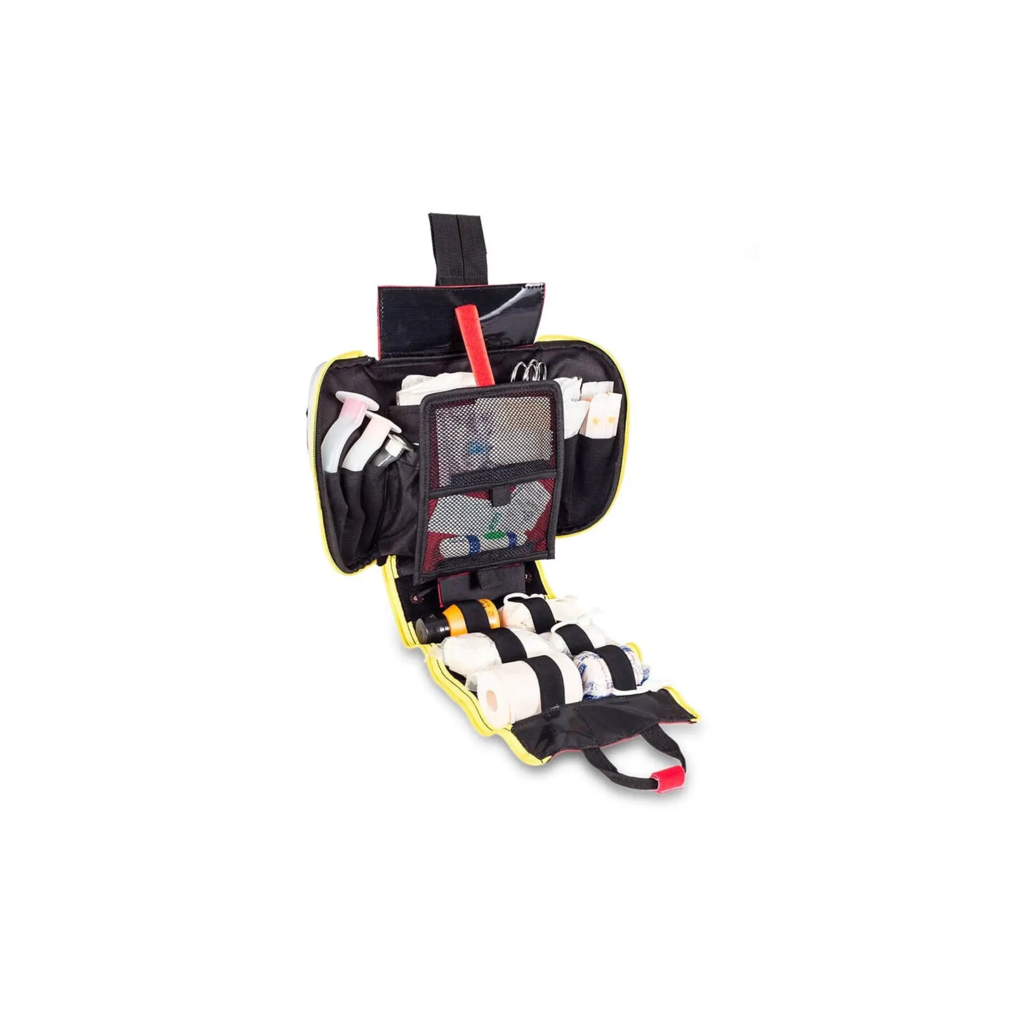 • Elastic bands and mesh pockets for first aid supplies