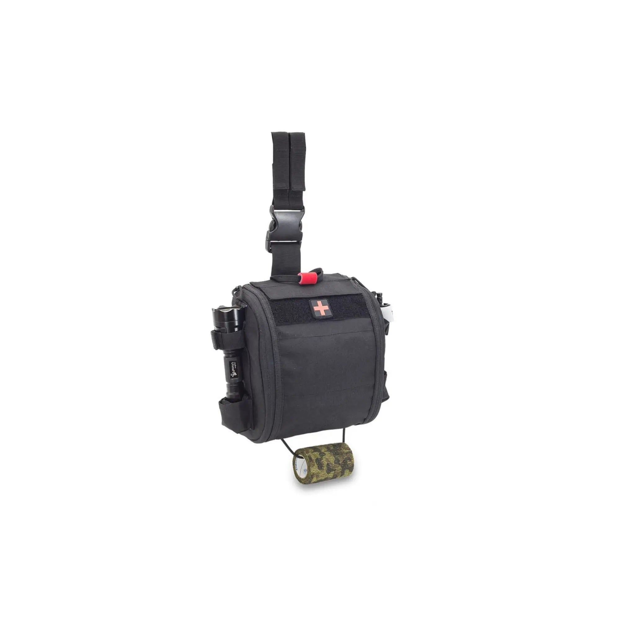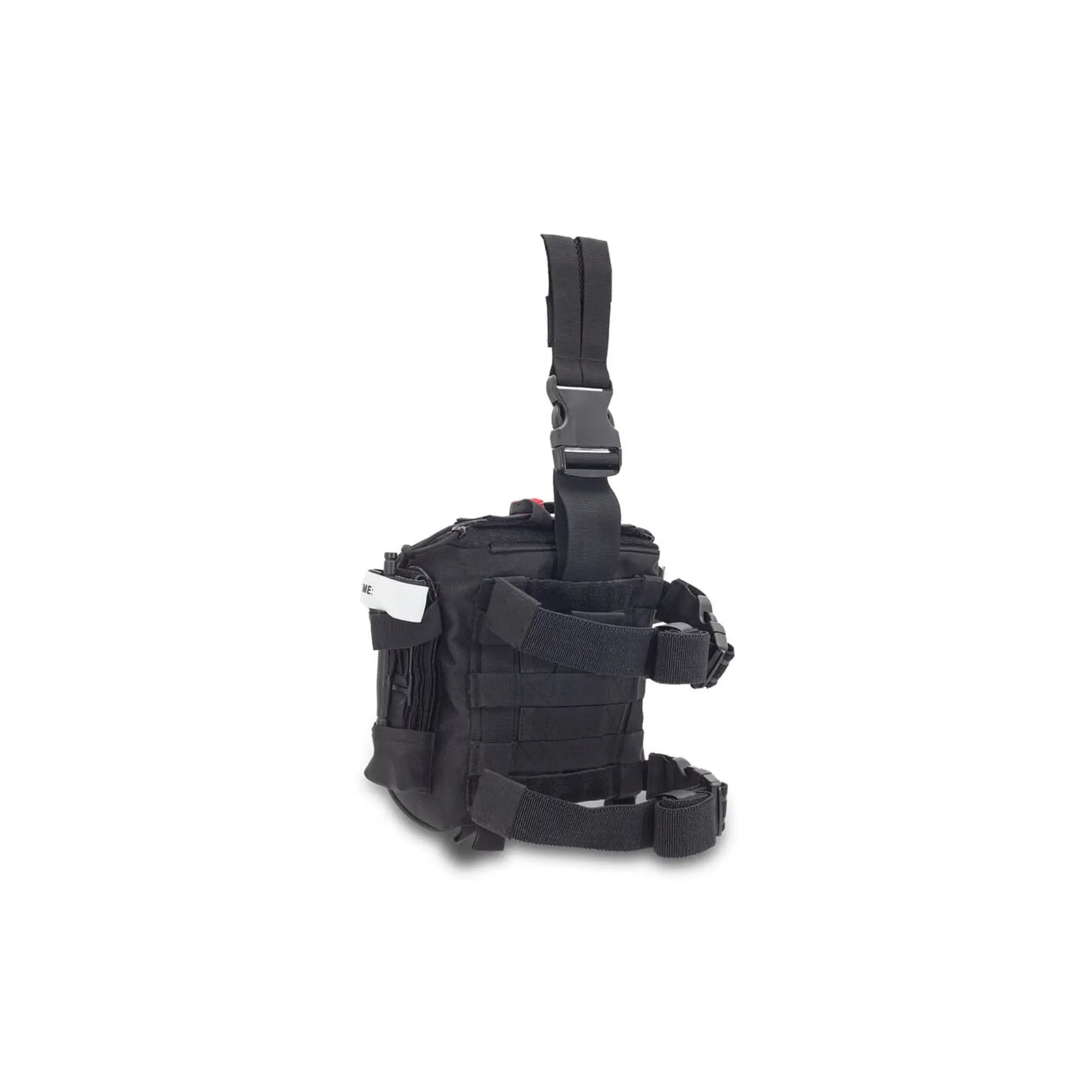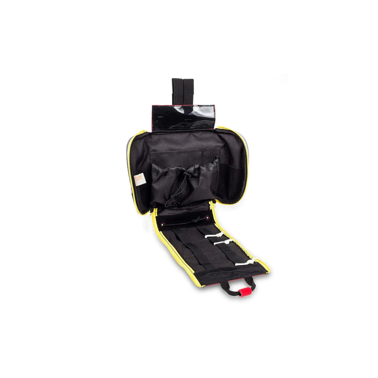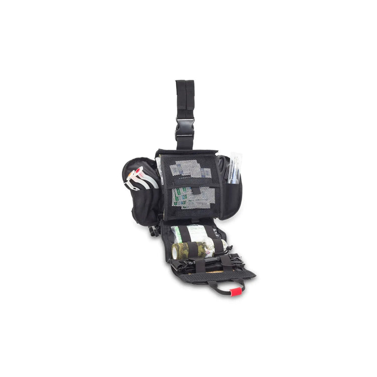 First aid kit for paramedics. Its large size and design allow for the transport and organization of medical and emergency supplies. Its dual fastening system (waist/leg) facilitates carrying. Furthermore, it is adjustable, and the anti-slip bands prevent the bag from shifting when worn on the leg.